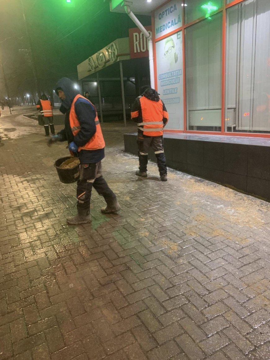 În sectorul Botanica, serviciile municipale de profil intervin continuu, pe parcursul nopții și până în prezent, pentru reducerea riscului de alunecare și menținerea siguranței pietonilor.